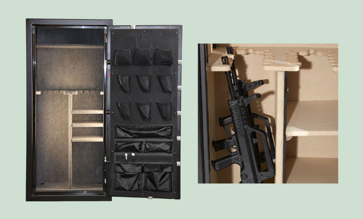 The interior includes padding, hooks, and shelves to prevent damage to the firearms. Some models also provide protection against fire and water.